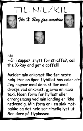 Det er en fax sendt i rekommandert sending til NIL/KIL fra Raymond Fjellheim. Det går et kaldt drag gjennom det lille rommet som bare for litt siden var fylt med varme og sigarrøyk. Temperaturen synker ca 3 grader og det hele ser ganske kritisk ut et sekund. Raymond Fjellheim er på tur tilbake til Finnmark fylke, og det i rekommandert sending til NIL/KIL via flyselskapet Color Air. Må kabalen legges på nytt?, må spillere bøte med sin plass?, har vi store nok shortser?, er flyet i rute?, har sigaren tatt fyr i ullgenseren siden trusa står i flammer?. Alt dette måtte besvares på få sekunder. Telefoner blir slått til hjelpetrenere og varamedlemmer i en fart som gjør telefonledningene glødende, og like før deadline er heldigvis alt på plass. Laget er klart, taktikken er lagt og Raymond Fjellheim kommer like før neste helg. Slik er hverdagen for ledelsen i NIL/KIL, beslutninger må tas på sittende hånd og sovende ankler, og heldigvis denne gang gikk det fint. Vi ønsker Raymond Fjellheim velkommen tilbake. Vi gleder oss.